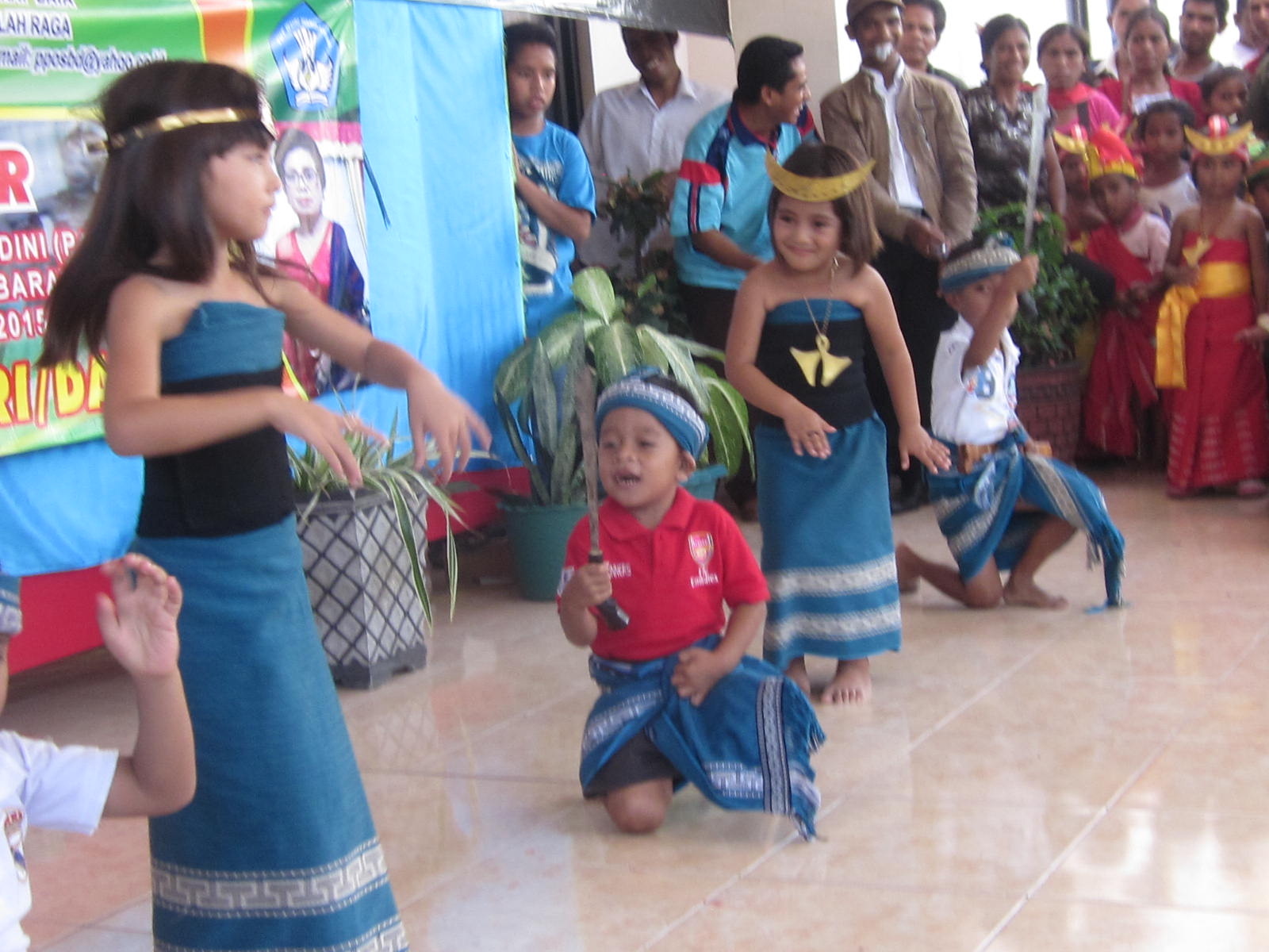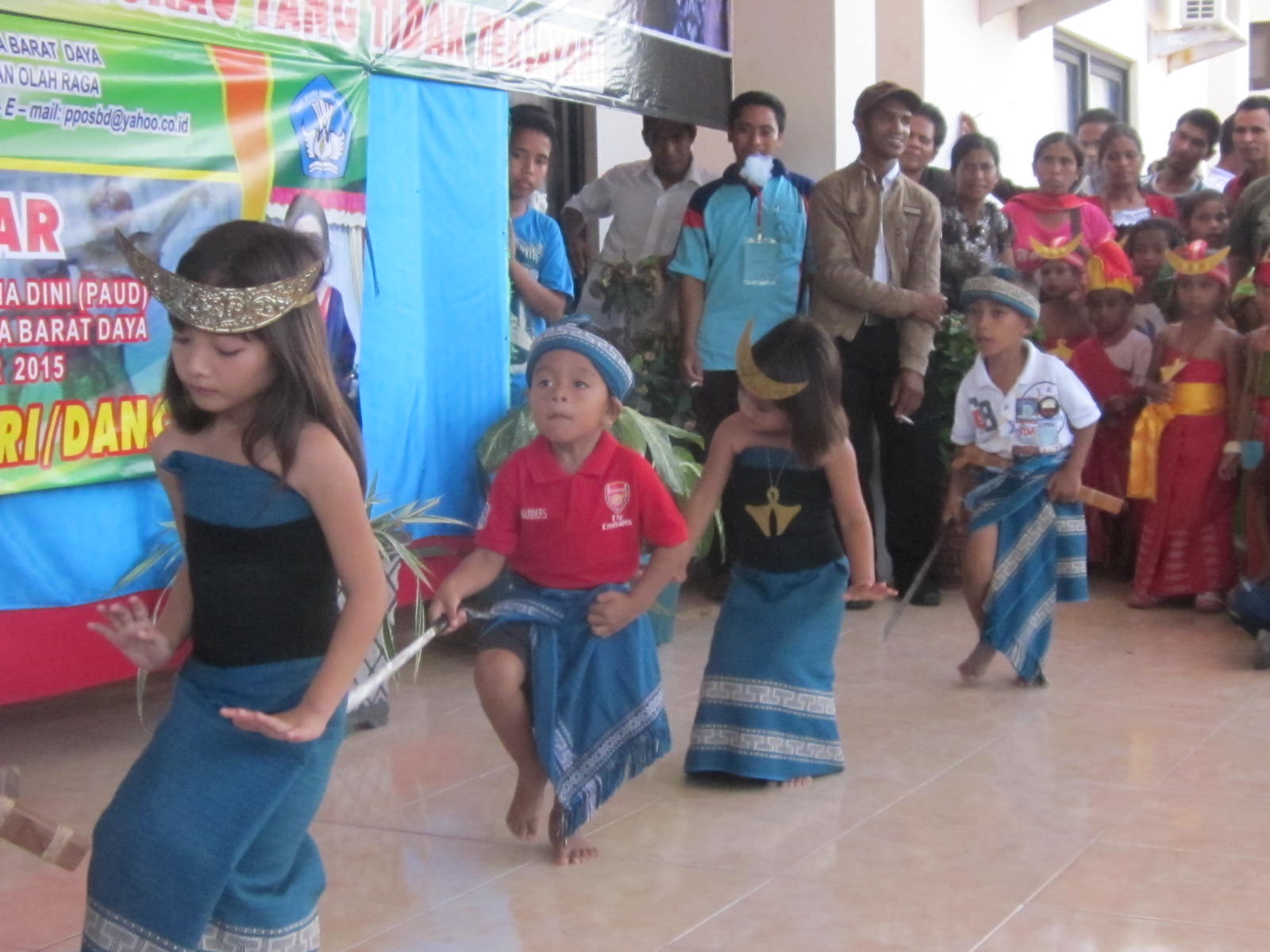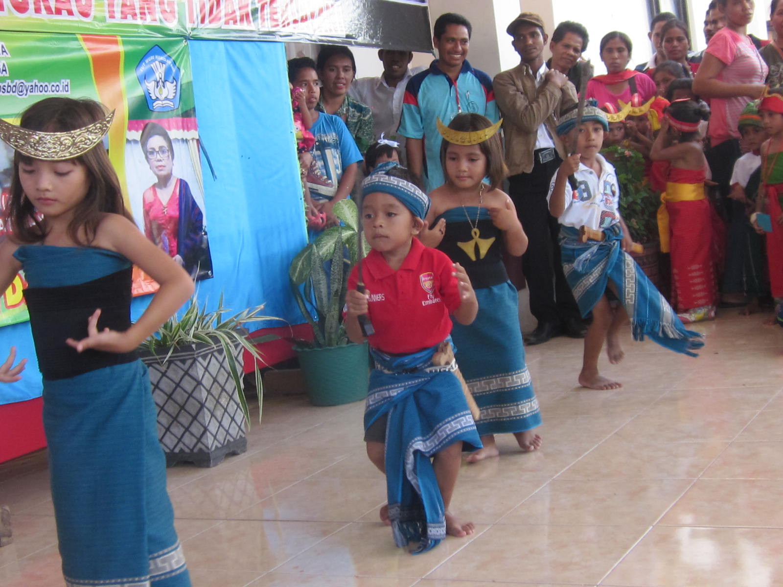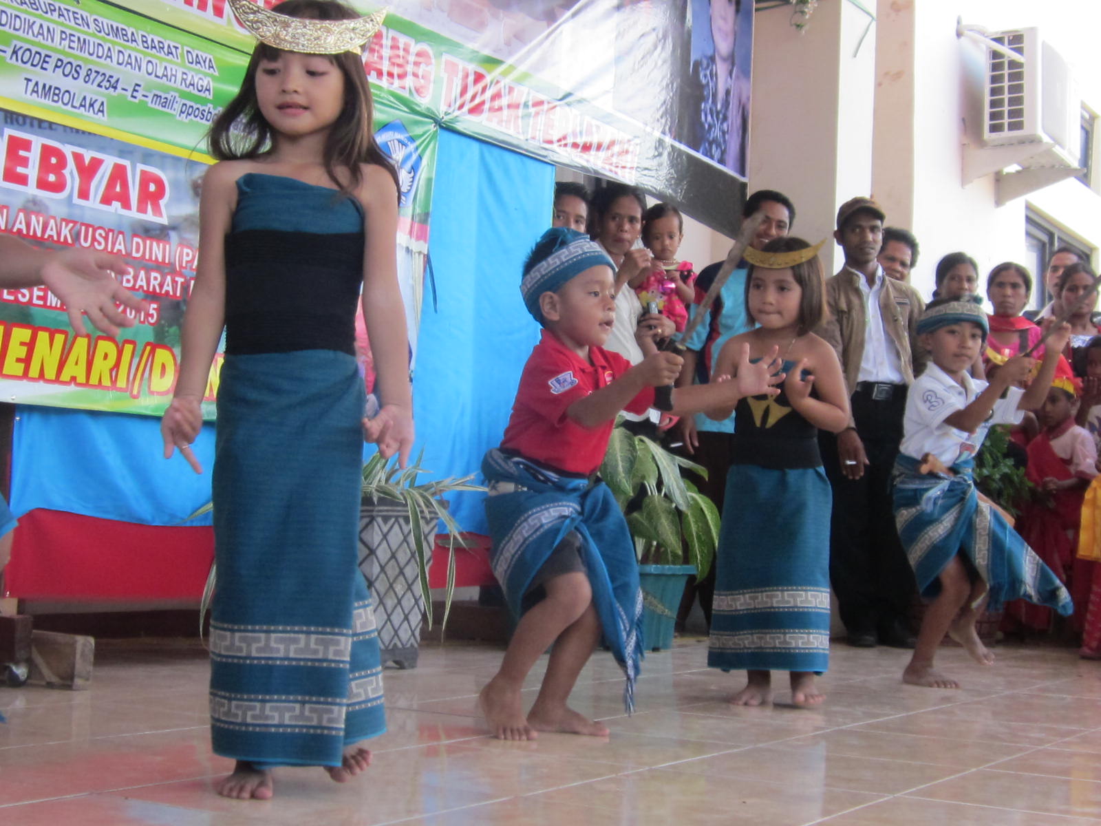 Nell’isola di Sumba, un’isola situate fra Bali e Timor, le Figlie di Maria Ausiliatrice hanno una comunità in un paese sulle montagne. Tra le varie attività della comunità, una suora si dedica all’insegnamento nella scuola materna parrocchiale e in questi giorni, il governatore dell’isola con alcune associazioni di donne, hanno organizzato una gara di canti, poesie e danze tradizionali. La scuola vi ha partecipato e i bambini si sono preparati con grande impegno, (dalle foto potete vedere come i bambini hanno messo tutto se stessi in questo), ottenendo così il secondo posto… ben meritato!